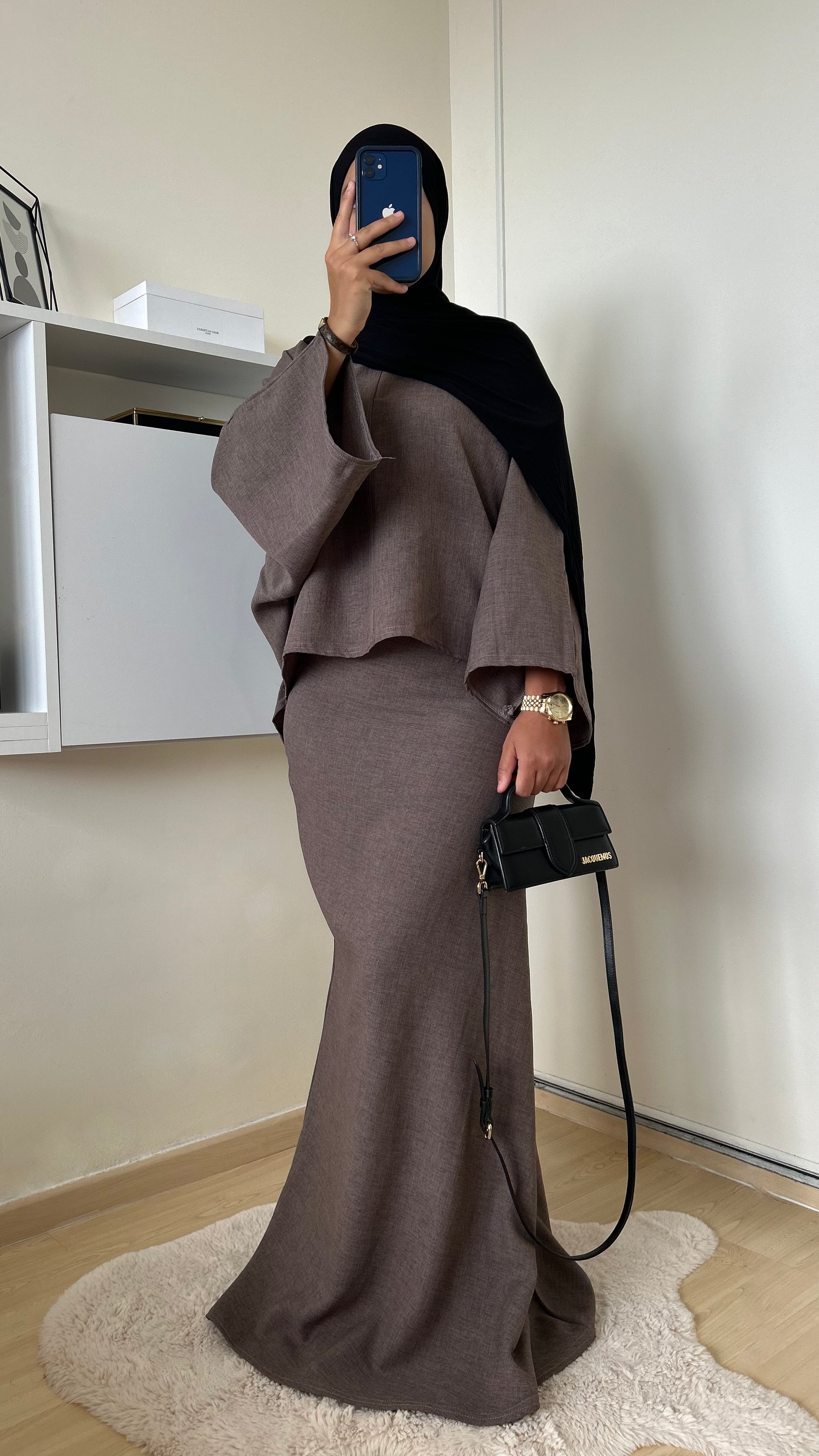 Ensemble jupe taupe . Taille unique, idéal pour les tailles 36 à 40. Le mannequin mesure 1m61.