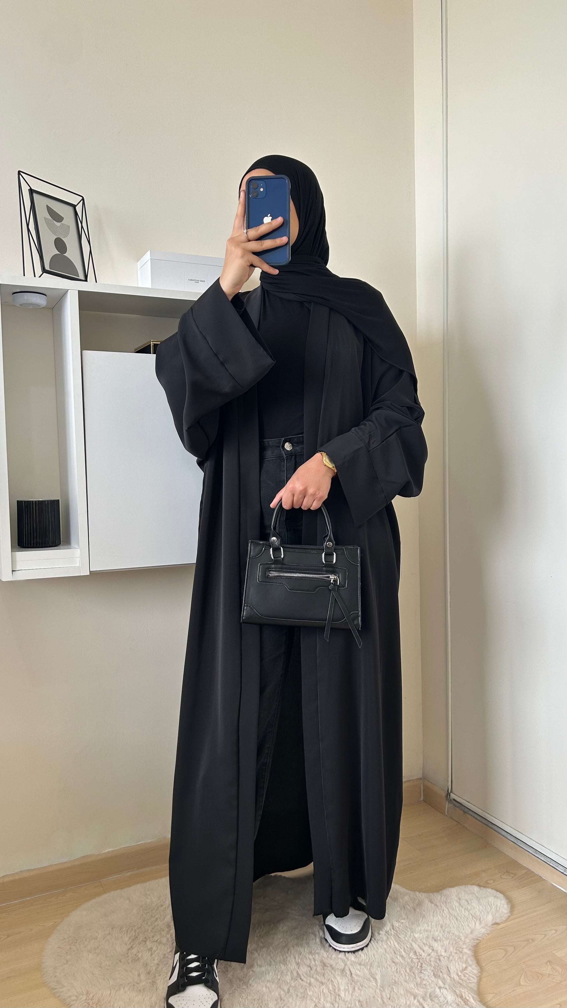 Kimono noir. Taille unique, idéal pour les tailles 36 à 42. Le mannequin mesure 1m61.