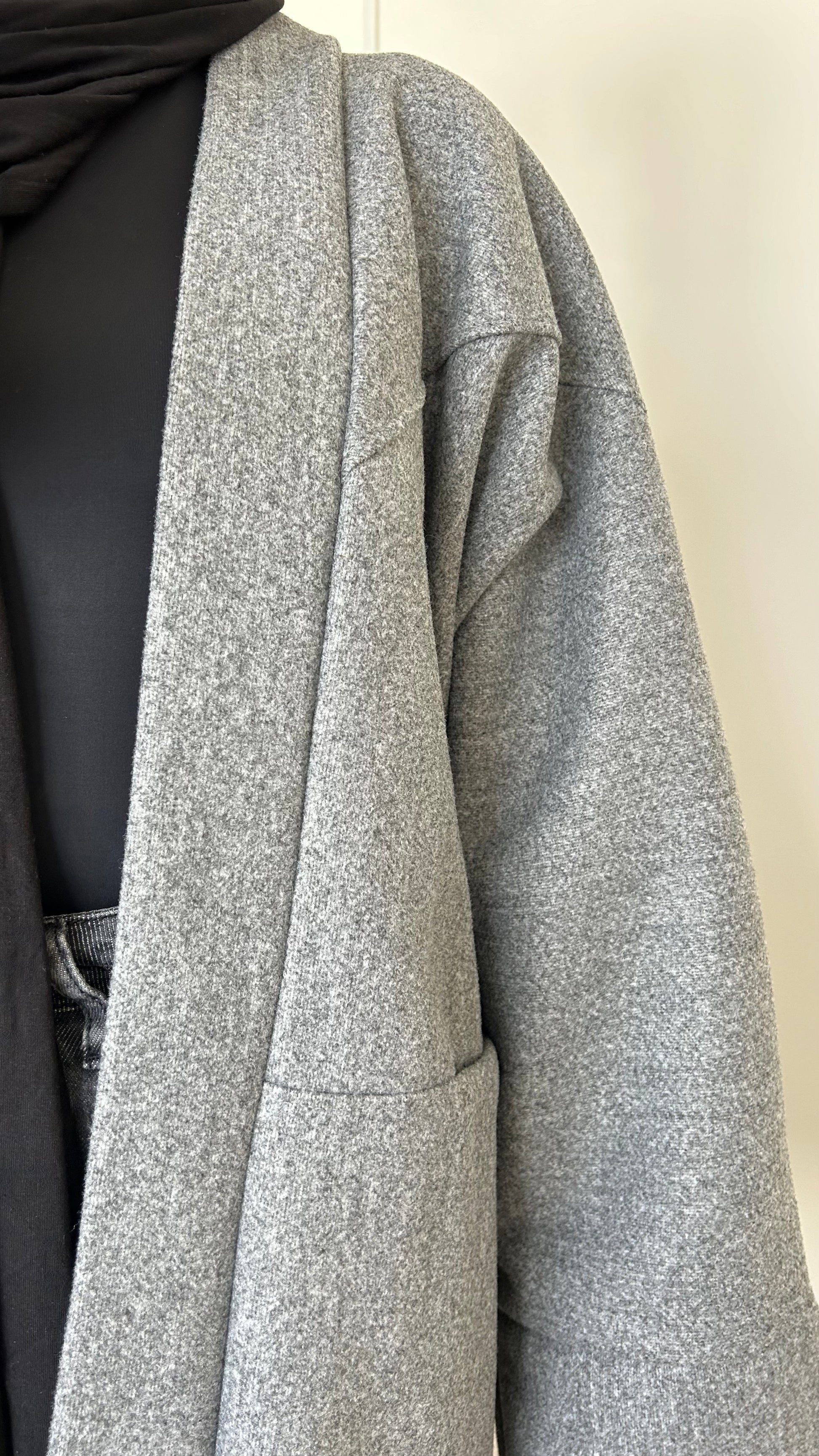 Manteau mi-long gris, avec poche. Taille unique, idéal pour les tailles 38 à 46. Le mannequin mesure 1m68.